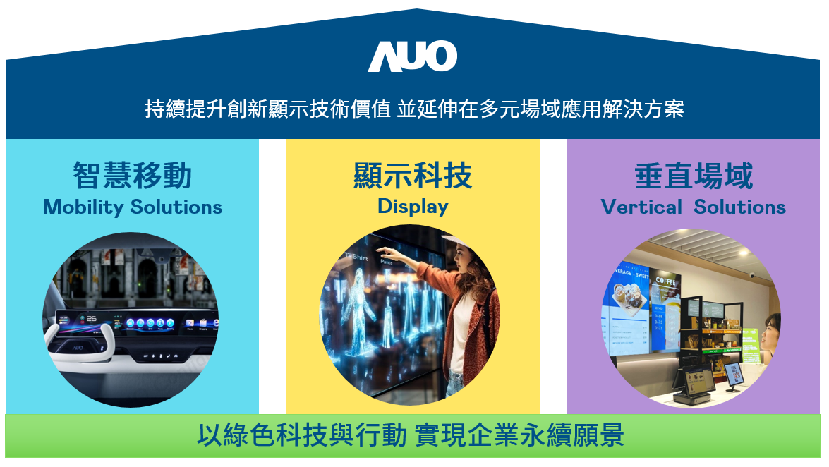 我們持續(xù)推動「雙軸轉(zhuǎn)型」,在精進(jìn)顯示技術(shù)附加價(jià)值(Go Premium),與深化垂直市場應(yīng)用(Go Vertical)的策略下,對應(yīng)友達(dá)的優(yōu)勢競爭力與趨勢,我們奠定顯示技術(shù)、智慧移動、垂直場域三大永續(xù)營運(yùn)支柱,在顯示技術(shù)領(lǐng)域的根基之上,延伸布局多元場域應(yīng)用解決方案。將先進(jìn)顯示科技助力智慧移動及垂直場域發(fā)展,並以綠色科技與行動為實(shí)踐,在轉(zhuǎn)型之路上貫徹永續(xù)經(jīng)營之願景。